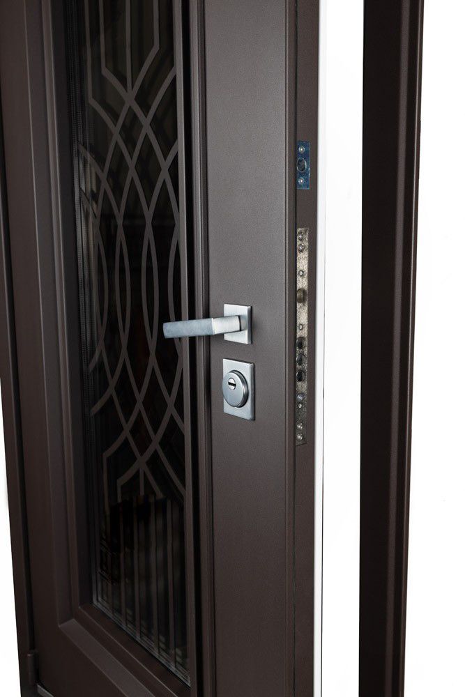 СБ-1 с окном, стеклопакет 2-х камерный, тонировка бронза зеркальная + резка Самурай внутри стеклопакета в цвет двери